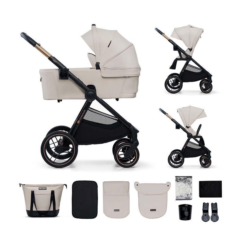 Las capotas extensibles están hechas de tela impermeable con filtro UPF50+. Ambas tienen paneles de ventilación y protección solar. El kit incluye una mosquitera, un plástico impermeable y un cubrepiés.