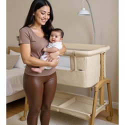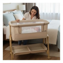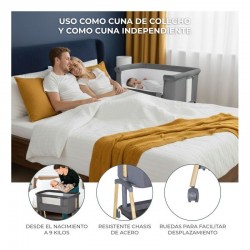 Cuna de colecho 2 en 1: puede usarse como cuna de colecho acoplada a la cama de los padres o como cuna independiente. De diseño moderno, con estructura de aluminio y patas efecto madera, ofrece un interior espacioso con acolchado para mayor comodidad y bandeja portaobjetos. Es regulable en altura e incluye una malla para vigilar al bebé. Además, es plegable y compacta, lo que facilita su almacenamiento y transporte.